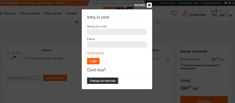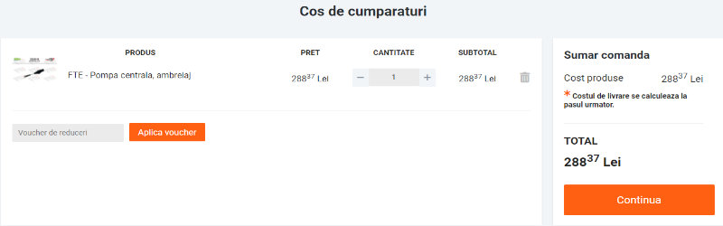 Dupa ce ati apasat butonul “Adauga in cos” produsele dumneavoastra ajung in cosul de cumparaturi, unde aveti optiunea de a vizualiza lista de produse, sa modificati / stergeti cantitatea sau sa aplicati un voucher de cumparaturi. Apasati butonul “Continua” pentru a merge mai departe cu procesul de comanda.