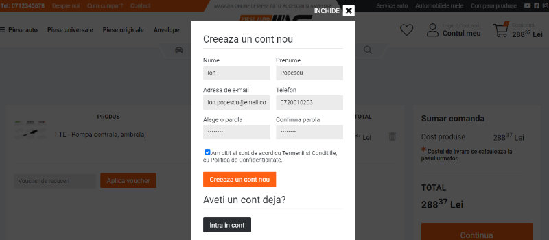 Introduceti datele dvs de identificare precum Nume si Prenume, Adresa de email si numarul de telefon, apoi bifati casuta de acceptare a “Termenilor si conditiilor” cat si a “Politicii de confidentialitate” si apasati butonul “Creeaza un cont nou”.